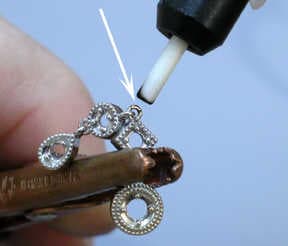 For this project, the No. 1 tip was used with the ABI Pulse Arc Welder. Five tips come with the unit giving the user multiple choices for the wide variety of welding applications commonly encountered by bench jeweler generalists. Periodically, the electrode and ceramic collar need reshaping. Here a diamond wheel is used to reshape the electrode.