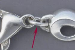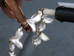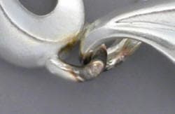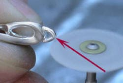 Because sterling silver is a good conductor, the two link combinations required less energy from the welder to complete each joint. A pulse of energy at the top portion of the link was used to begin the welding process. The electrode was recessed in the ceramic collar about 1.5 millimeters. A pulse of energy was used at each side of the link. Next the top of the tip was angled and a pulse of energy directed toward the bottom of the link. This procedure caused little deformation and only minor surface discoloration that was removed by pickling and ultrasonic cleaning.