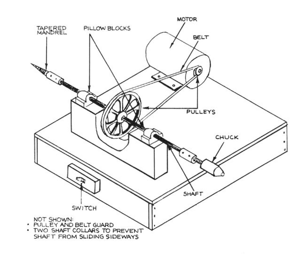 The shaft is made from a length of ½" drill rod, available in any industrial hardware store or Sears. The pillow blocks, pulleys, belt and shaft collars should also be available at these sources. Tapered mandrels come from any jewelry tool supplier. Make sure to specify a left and right mandrel if you wish to have one at each end of the shaft. To make the machine more versatile, put a threaded work-arbor or chuck on the right end of the shaft only. These are also available at Sears or hardware stores. Electrical supplies are also standard hardware items.