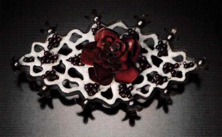 Among those attention-getting enamels was Cynthia Miller's confident nine-panel "Gold and Jewels Rising from the Mist" which also captured the Enamellist Society Award. Hanging on a white manikin, by many frighteningly wispy "threads," the heavy and ball-like formed copper hanging "Dendritis Chromium" by Damia Smith won the Thompson Enamel Certificate Award.