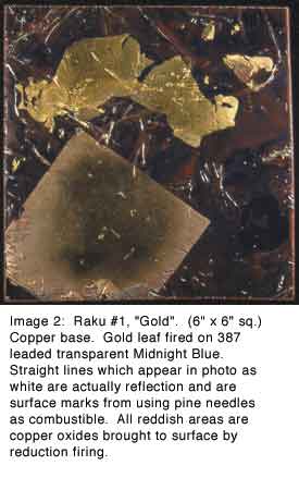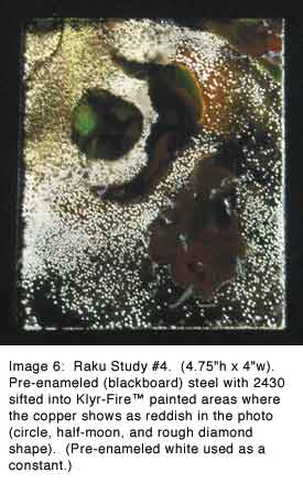 I have been puzzled several times when copper appears on the surface after the raku firing, and I know I did not put any copper oxide enamels on the piece. My feeling has been that copper is somehow being dragged from the copper plate to the surface. One plate that was fired with pink transparent and ivory beige had a lot of copper and around the edges. It looked as if it had been electroformed with copper; the copper extending in over the enamel a couple of millimeters. (The fact that the piece had been cut with a torch helped this effect.) After observing and assessing work done at JCCFS, we decided that it does indeed have to be coming from the base copper.
