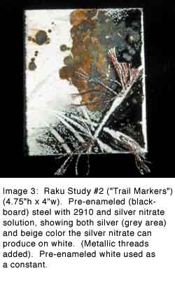 After the enamelist has done a few pieces, however, the delight in the unpredictable results can easily turn into frustration at the lack of control one has over the materials. The question becomes how to push the raku process from being a 'let's throw this in the raku pot and see what happens' event into an intentional use of materials and what we know in order to produce cohesive work with some life and integrity - works of art which will convey visually a message or feeling.