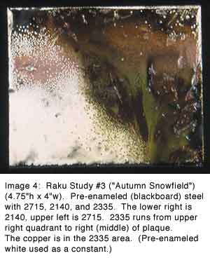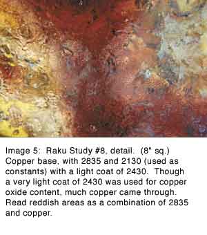 Some years ago I tested some of the lead-free enamels at Thompson Enamel with the help of Woodrow Carpenter and his knowledge of the make-up of these enamels. All of the following enamels mentioned are Thompson Enamels. Gold and cadmium-selenium reds and yellow were tested with disappointing results. Though occasionally there are gold glints in the metallics, I think they are more apt to be coming from some copper content, not from the gold. Cobalt-based colors also give no metallic surfaces. Some iron can be drawn out of 2110 ivory beige, but that color is more useful as a constant. The two best oxides are manganese and copper, with copper being by far the most successful. Nile green (2305) was tested for its nickel content, but was more useful for its copper oxide.