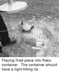 The studio should be set up so that the work can be taken out of the furnace after the last firing and immediately dropped into a garbage can or other container with a lid. At JCCFS, we were able to have one kiln outside on the porch. I usually flip the work over so it lands face down in the material. It may also be dropped in face up, with a little combustible material then dropped on top. If the piece is small, I often will throw rack, trivet and work into the can, on the theory that more hot metal will ignite the leaves or wood more easily. Wait a few seconds until the combustible material bursts into flame and then put the lid on tightly. Occasionally here in the Northeast, the leaves will be damp. If they don't flame up, quickly throw a little dry material on top of the work. If they still haven't flamed but are producing a lot of smoke, then close up the can anyway - it often will work well.