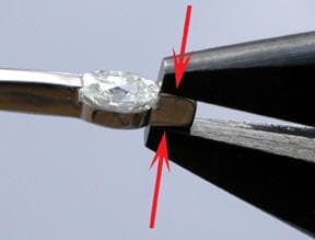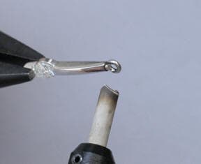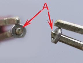 These 2 views show the brass tweezers lead holding the jump ring. One side of the tweezers points was rounded (A) so no sharp edges of the tweezers would come in contact with the inside radius of the jump ring. Rounding the point increases the contact between the inside of the jump ring and the tweezers and reduces the potential for a destructive tack weld.