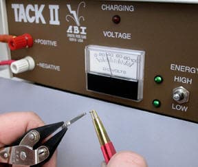 The ABI Tack II was set on the high energy setting, with 30 volts. FIRM contact was made between the two parts and a single pulse of energy was released by tapping the footpedal once. Now the two parts are temporarily held in position for a more permanent attachment done by soldering or welding.