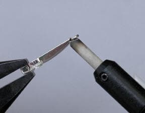 The jump rings will be tacked using the ABI Tack II tack welder. The tack welding will be done using the parallel pliers and brass tweezers leads. The pliers are attached to the positive terminal of the tack welding unit. The parallel pliers make very good contact with the earring and the operator is able to hold the assembly securely.