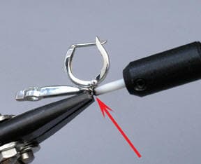 To accommodate this request, a jump ring is pulse-arc-welded at the top of the earring and the jump ring on the new interlocking lever back dangle finding will be permanently welded shut. This will keep the integrity of the spring action of the finding without annealing it.