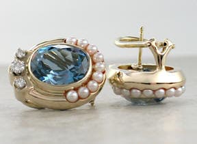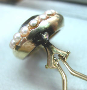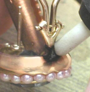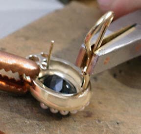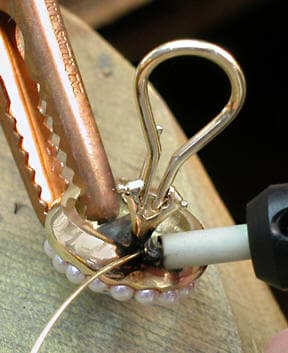 This project shows a challenging repair and reconstruction of earrings with a broken Omega clip and heat sensitive gemstones. One of the Omega clips has broken off the earring. The center stone and cultured pearls are heat sensitive making the repair difficult with a torch.