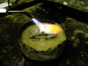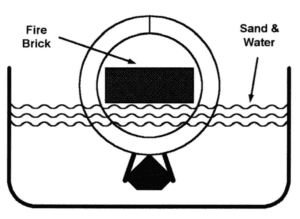 To make a water cup, cut the bottom 1″ off a soft drink can. This works particularly well, as the aluminum does not rust as other metal containers do. Fill the cup 3/4 full of fine white sand and cover with water. Then the jewelry you are soldering is easily held in place by sticking the stone down into the sand. In addition, place a small piece of firebrick or cutoff from a ceramic soldering pad through the finger hole of the ring. This helps protect the stones but more importantly, it reflects the heat back up to the bottom of the shank, making soldering much easier.