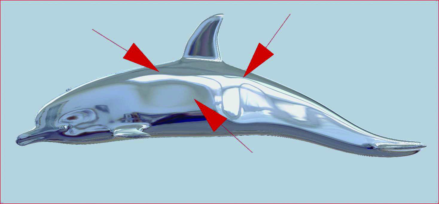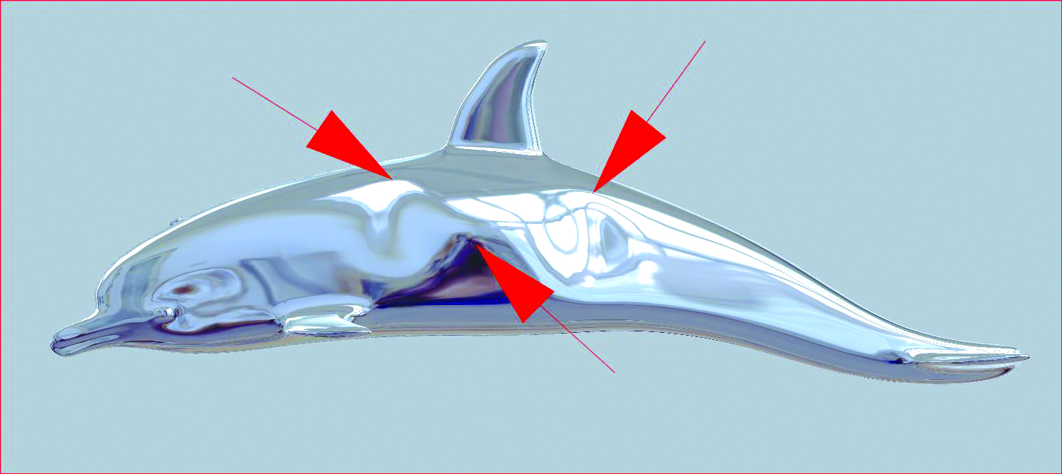 The indentations along the side of this dolphin charm, for example, are clearly noticeable (right top). The "EMap" (environmental map analysis) command reveals discontinuities in the curvature of the surface, indicated by the red arrows.