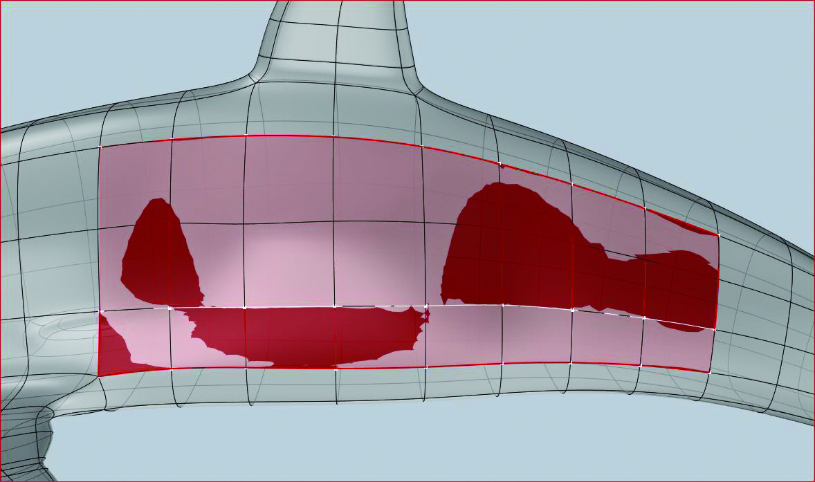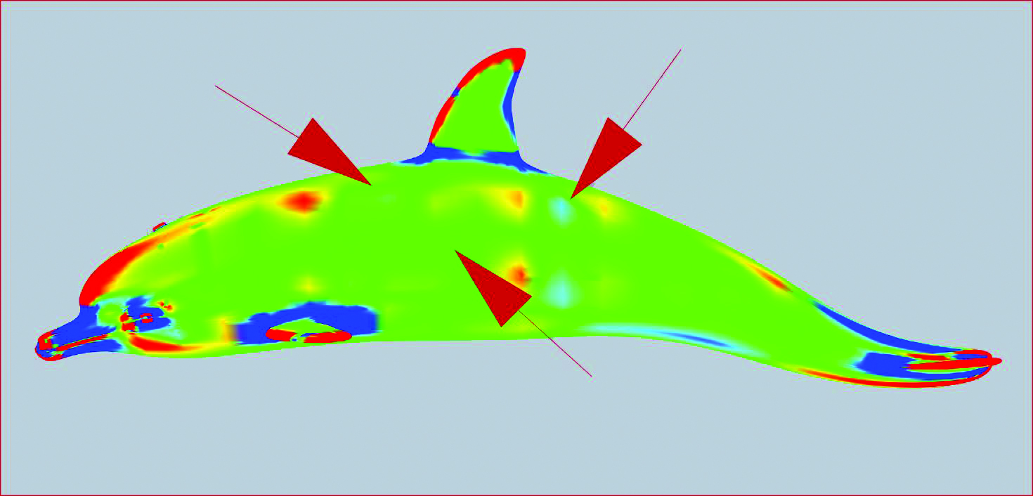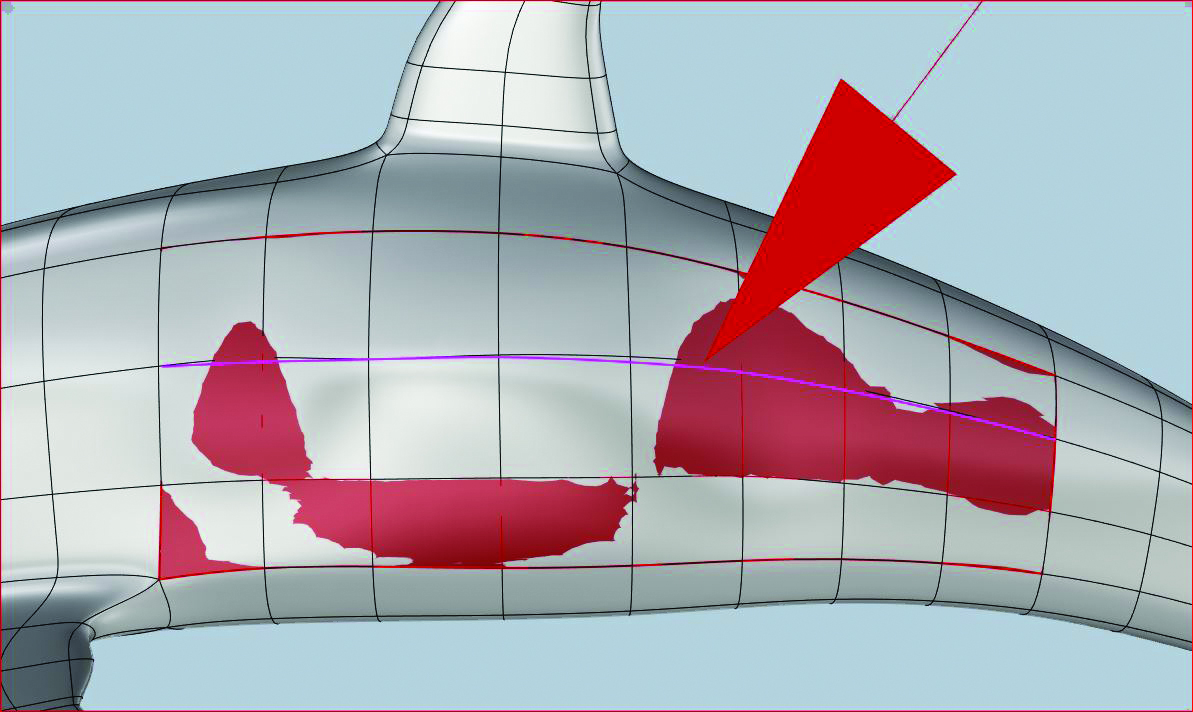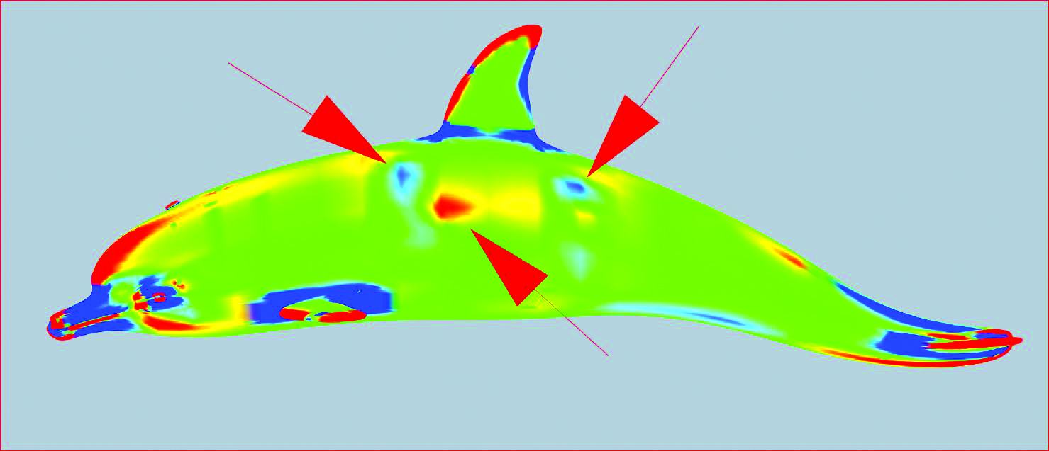 Begin by mentally isolating the area with the deformation. In this case, it is the mid-section below the fin and behind the flipper. Use the "curvature analysis" command to assist in determining areas with surface discontinuity. The areas in blue and red show where the surface bulges and dips, distorting the side of the model.