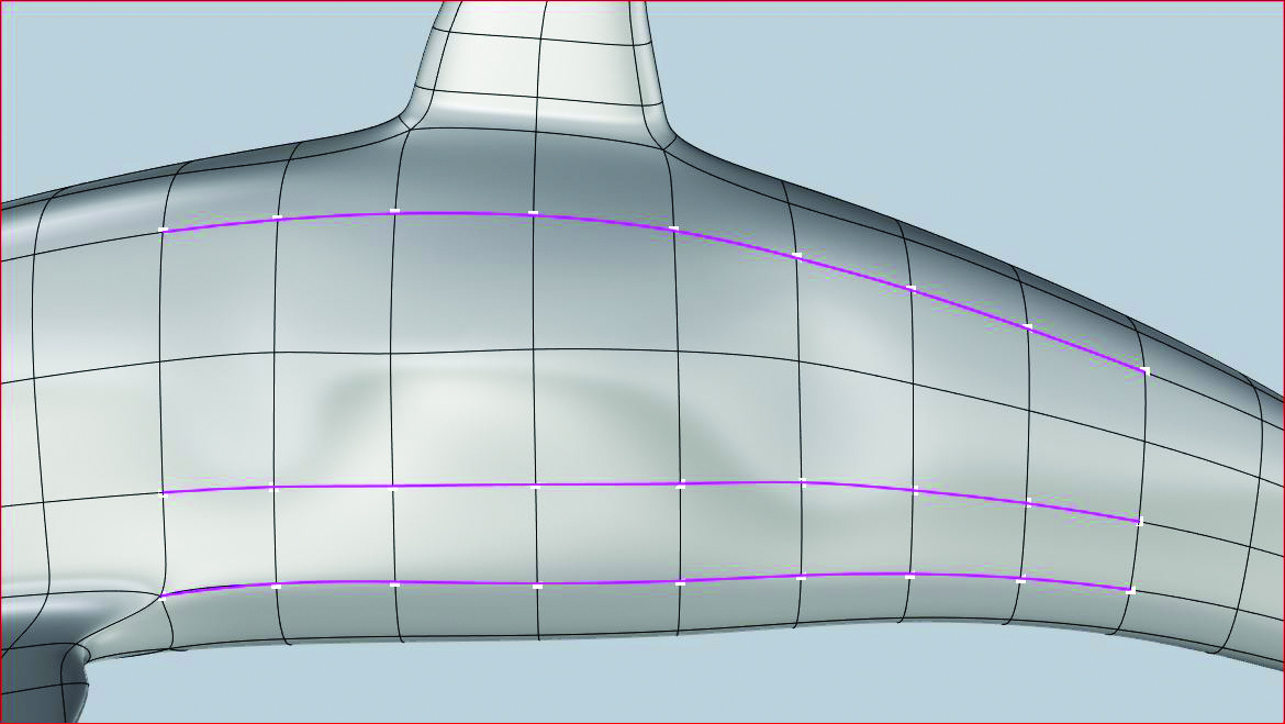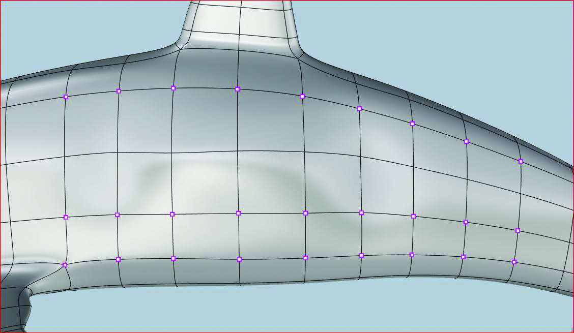 With the point snap on, place Rhino point objects along the ends of T-splines edges in a loop just above the distortion and along the ends of two loops of edges just below the distortion. Each row of point objects should be alongan equal number of edges. Creating a total of three rows will become important in a later step.