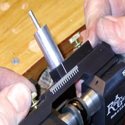 The marking punch has measurement marks for accurate marking. Here the layout pointer is lined up with a previously scribed centerline.