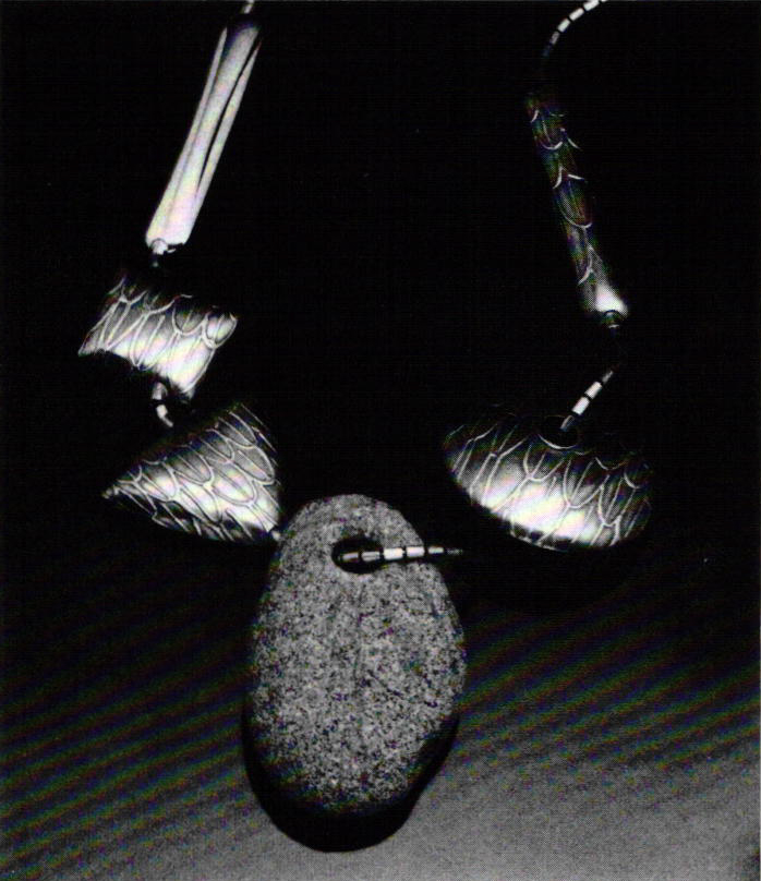 By contrast I think of the work several people, among them Jan Yager. In her work, as illustrated in the necklace shown here, the embossed surface takes its place alongside form and composition as an ingredient of equal importance. The highly polished pillow shapes present their recurring pattern in a series of alternate formats. These engage the viewer through their subtle differences. The natural stone and smooth-surfaced bead provide relief and contrast to the pattern and, in the end, locus attention on it. This kind of embossing is more than simply a quick way to break up a surface before "really getting down to work." It is an integral part of the sense of the piece.