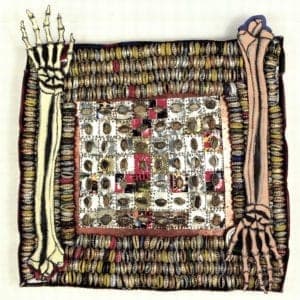Two Arms on a Quilt, 1994 is a transitional piece between the quilt format and the anatomical fragments Beecher concentrated on in her 1995 Greg Kucera Gallery exhibition. With bottle caps as the wide border, Beecher summons up the skeletal arms and hands of dead quilt makers in another memorial tribute. A small stone is inserted into the center of each of the 56 smaller squares at the center. These might symbolize the quilt makers' stone foundation as a part of American folk art heritage.