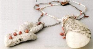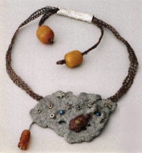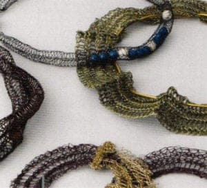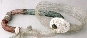 Very early on, Ruth Robinson developed her own, new and independent working technique. Very fine gold and silver wires are knitted or woven, thus creating necklaces, bracelets or earrings possessed of great lightness. She works items into them that she brought back from her travels. The magic spread by this work is also based on the fact that the unusual findings lose their coincidence and isolation in the jewelry. They become part of the whole and therefore tell their own story.