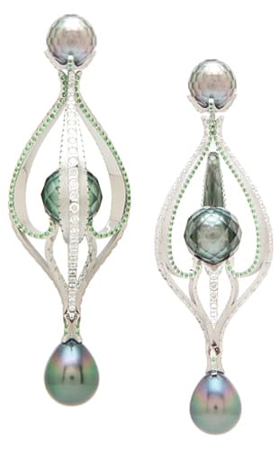 When all sides of a dangle earring are beautiful, choosing the side to face front can be problematic. Ryan Roberts of Santa Fe, New Mexico, found a solution: A tiny ball hinge set into the pearl at the top of the earring that enables it to slowly revolve while worn. With all perspectives showcased, these palladium earrings set with Tahitian pearls, diamonds, and tsavorite garnets earned Roberts the grand prize in the 2013 Saul Bell Design Award Competition.