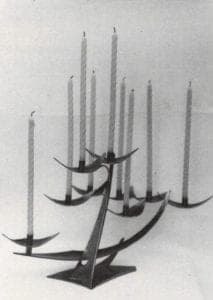 When I returned from Europe in 1951, my friend Margaret de Patta called and invited me to join a group of metal artists who were structuring an organization dedicated to the needs of producing craftsmen. This group held monthly meetings which I attended, and at one I helped select the name Metal Arts Guild (now often just MAG). At that time I was struggling to earn a living as a jeweler and enamelist and had had no training in other areas of metalsmithing. I had owned a gallery while I was a student at the Institute of Design in Chicago, so I volunteered my display experience to the MAG exhibition committee.