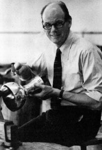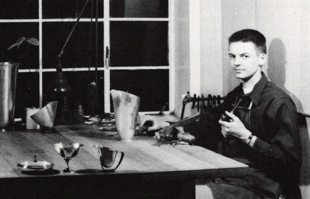 In 1948 one of the newly hired Scandinavian teachers was John Prip. Although Prip was born in the United States, his family returned to their native Denmark when he was 10 years old. Sixteen years later, as a fourth-generation silversmith, Prip was content with his environment in Denmark, but was curious about his country of origin. Because of the war he had been unable to travel. Then through the Danish Society of Arts and Crafts he heard about the job opening at SAC in Alfred. At age 26 he joined the faculty.