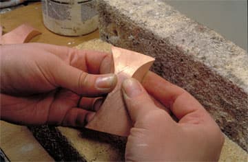 Here is what a piece looks like after bending. In copper, fine silver and platinum one can bend it up in one go, gently. In sterling and gold alloys it may take several rounds of bending a bit, then annealing, then continuing to bend to reach the degree of bend you want. If you are going to anneal during bending flux the scored line to prevent it oxidizing and after annealing use hot water, not pickle, to remove the flux residues before continuing to bend. This will keep the scored metal clean and encourage the final solder to flow well.