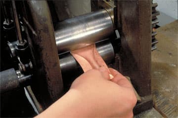 Because the disc wants to leap over the edge away from you and come back on the other side lift the disc off before you arrive at the far edge and turn the metal around so the part near the edge is towards you before continuing. When you see a distinct raised line on the other side it is time to stop. If you go through burnish it closed before soldering .Such scored lines, where metal has been removed, need soldering to gain strength.