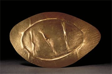 A brooch, copper, gold plated, note how the scored line runs around the bend in the middle of the sheet.