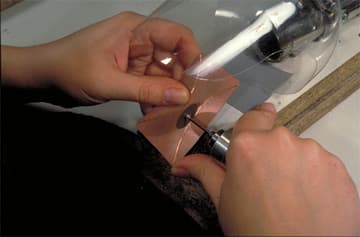 This shows carving into the metal sheet with the silicon carbide separating disc. Notice that the sheet is held in the air, not against the bench pin, this is in order to be more sensitive to the pressure used (rather like working in wax) and incidentally, decreases the noise of using the disc. Again, I recomend using a sticky wax like beeswax, not a lubricant like Burrlife®.