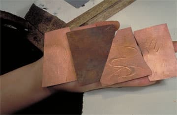 Here are the finished grooves. Multiple light passes with the disc are preferable to pressing hard and going through the metal. The sheet is continually turned over while working to see what the raised line on the front looks like.