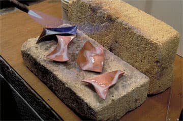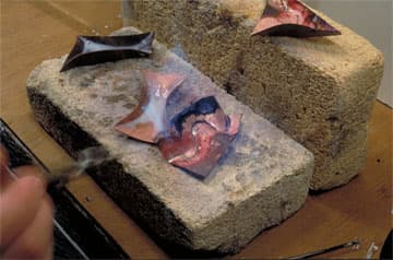 As you can see, in 'dirty' metals like copper and even sterling I am a big believer in using lots of white paste flux to ensure a proper soldering. My experience is that when students fail at soldering most of the time it is because their flux burned out. If you use a lot of flux this problem is avoided. On fine silver and gold alloys the problem is not so acute and other, thinner, self-pickling type fluxes may be used.