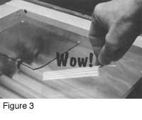 This is demonstrated in Figure 5, which shows the screen (green) over the drawing (Wow!), and the lights on. The light will harden the emulsion in all of the screen except for where the letters are. In contrast (pun intended) the parts of the screen under the black letters are shielded from the light so that they remain water soluble.