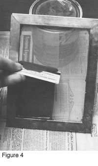 I use a standard silk screen photo emulsion kit, from an art supply store. Follow the instructions in the kit. Mix up the emulsion and spread it on the screen. I prefer to spread it on with a credit card, as shown in Figure 4. The goal is to get an even layer of emulsion - no drips, no holes, and no air bubbles. Then dry the screen. Aiming a fan at it will expedite the process.