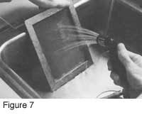 When the exposure is complete, follow the directions in the emulsion kit, to wash the screen. This is done in Figure 7 with a spray of water.