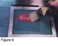The basic idea here is to put the screen over a metal plate, and sift or brush the enamel through it. In Figure 9, a red enamel is being brushed through the screen.