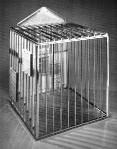 This exciting collection of work synthesizes her separate loves for both fiber and metal. The pedestals are generally cube shaped, from 12 - 16″ on each side, with attention paid to each side. Pattern has emerged as a dominant factor, referencing traditional quilt patterns. As seen before, titles are given emphasis and offer important insight into the work. In this series, the titles often reflect the name of the quilt pattern being used. An example of this is a pedestal entitled Baby Bloch to Creativity, 1990, which uses the quilt pattern "baby block". The prominent material used throughout the pedestal series is printed steel salvaged from metal doll houses. Deconstructing these doll houses is also a way of "…deconstructing childhood fantasies and reconstructing, or rebuilding, a statement about adult realities", she explained.