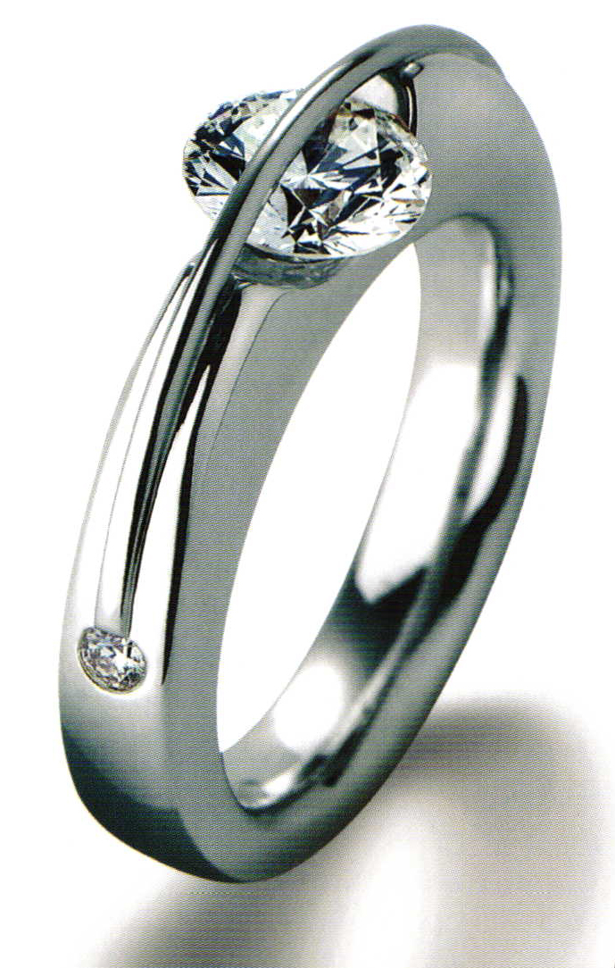 "Spirals" are colored stones in the center of diamond spirals. They are offered as round, oval, triangle and rectangular spirals. "Infinity" setting frames the center stone and forms the pendant's loop - like the number eight. In many cultures the eight is a magical number, denoting harmony and infinity. "Comfortable" rings with rubber bands. They are very comfortable due to the flexible bands. International Jewellery London, booth 755