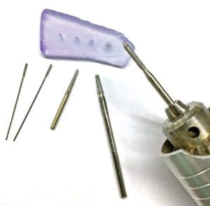 Here are my most-used 120-grit diamond burs for creating the initial drilled holes in stones, ceramic, and glass. They range from a 1 mm drill bit, a tapered 2 mm cone, a 3 mm cone, and a long bud bur with a shaft the same diameter as my most-used 3 mm diameter silver tubing. I also use the identically shaped bud bur in 300-grit and 600-grit for final sanding.