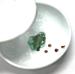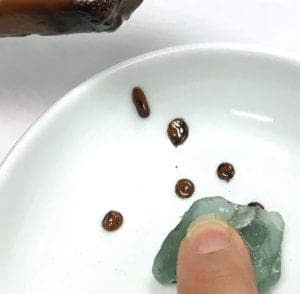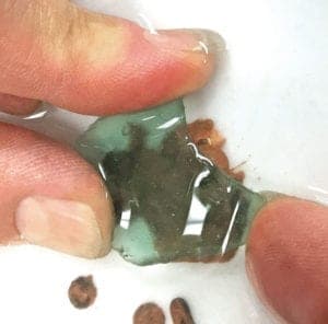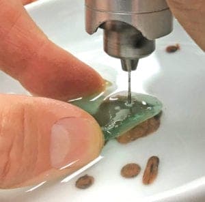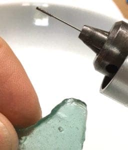 Once you've drilled completely through, pop the shard off the wax. If it sticks, pour out the water, let everything dry, and put the dish in the freezer for a few minutes to chill and harden the wax. Most of the time, the cold wax will release the shard very cleanly. Any lingering wax can be cleaned up off the stone with a cotton swab dipped in acetone.