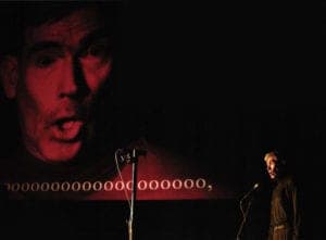 Jaap Blonk performing Schwitter's Ursonate with real-time subtitles by Golan Levin. At Ars Electronica 2005