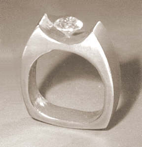 The 6-mm CZ is the center of attention of an anodized titanium ring. The gem is set within the protective confines of two peaks; and I have given it the appellation 'Gothic' ring. It was milled from a piece of titanium alloy Ti6Al3V using a computer controlled milling machine.