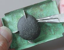 To set the pebble, bend a couple arms of the bracket outward so you can slide the stone into position. Bend the tip of each bracket arm back to its original position. Cold connection number three.