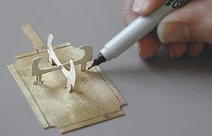 Apply a piece of sticky-backed label paper onto a sheet of sterling and trace the patterns with a sharp pencil or fine-tipped pen. Saw out the two bracket pieces and smooth the edges with a fine needle file. Polish to the finish that best complements the piece.