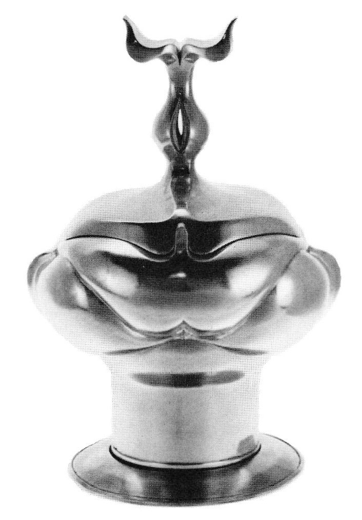 The first two goldsmiths were selected for their traditional Korean design motifs. Choi Hyun-chil is an associate professor and Chairman of the Crafts Department at Hong-ik University. His work is characterized by perfectly balanced, symmetrical designs in functional silver and gold objects, which express modern ideas, feelings and interpretations. He uses the casting method, assimilating richly carved patterns of traditional design motifs of plants, insects and other animal forms. Hong Jung-sil also specializes in traditional techniques, such as inlay with fine silver and gold wires on iron, sterling silver or copper. She is a lecturer at Seoul Women's College and has studied under living national treasures since 1975 to master and manipulate the traditional techniques of "Oh-dong-Sang-Kam." which is similar to the Japanese mokumegane technique. Her work interprets and emphasizes an old Korean favorite theme, "Ship-Jangseng." or 10 creatures which are the symbols of eternal longevity: Sun, Moon. Mountain, Water, Crane, Turtle, Pine Tree, Bamboo, Deer and Holy Grass.