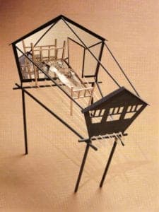 One Cold Night (1984) combines feelings of anxiety, claustrophobia, isolation and entrapment. These sensations are the result of a meticulous attention to detail, resulting in a certain preciousness. The house, a skeletal creature on trembling legs, becomes the stage for some cataclysmic trauma. The diagonal perspective stretches and compresses the space. This acuity is enhanced by sharp-edged pieces of Plexiglas that serve as floorboards. Inside, lying upon a narrow bed designed for torture rather than dreams, is an inert, globular form, a piece of sandblasted glass found on the floor of the glass studio of the artist's husband. It becomes the perfect metaphor for the cast-off woman. The silver wall that mirrors the room further enhances the cold loneliness and isolation of the feminine form. The small scale establishes an immediate intimacy with the viewer, negating any sense of voyeurism.