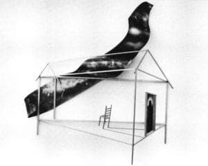 Like the sculptor Louise Bourgeois, whose Femme-Maison (Woman-House) is also an image of the house as a metaphor for the female soul/body, Kluge employs amorphous biomorphic forms or partial figures to indicate the human presence. At times she also includes chairs, ladders or birds to symbolize the human soul. The absence of human figuration results in an image that is both gendered and genderless, ambiguous, opened rather than closed to further interpretation.