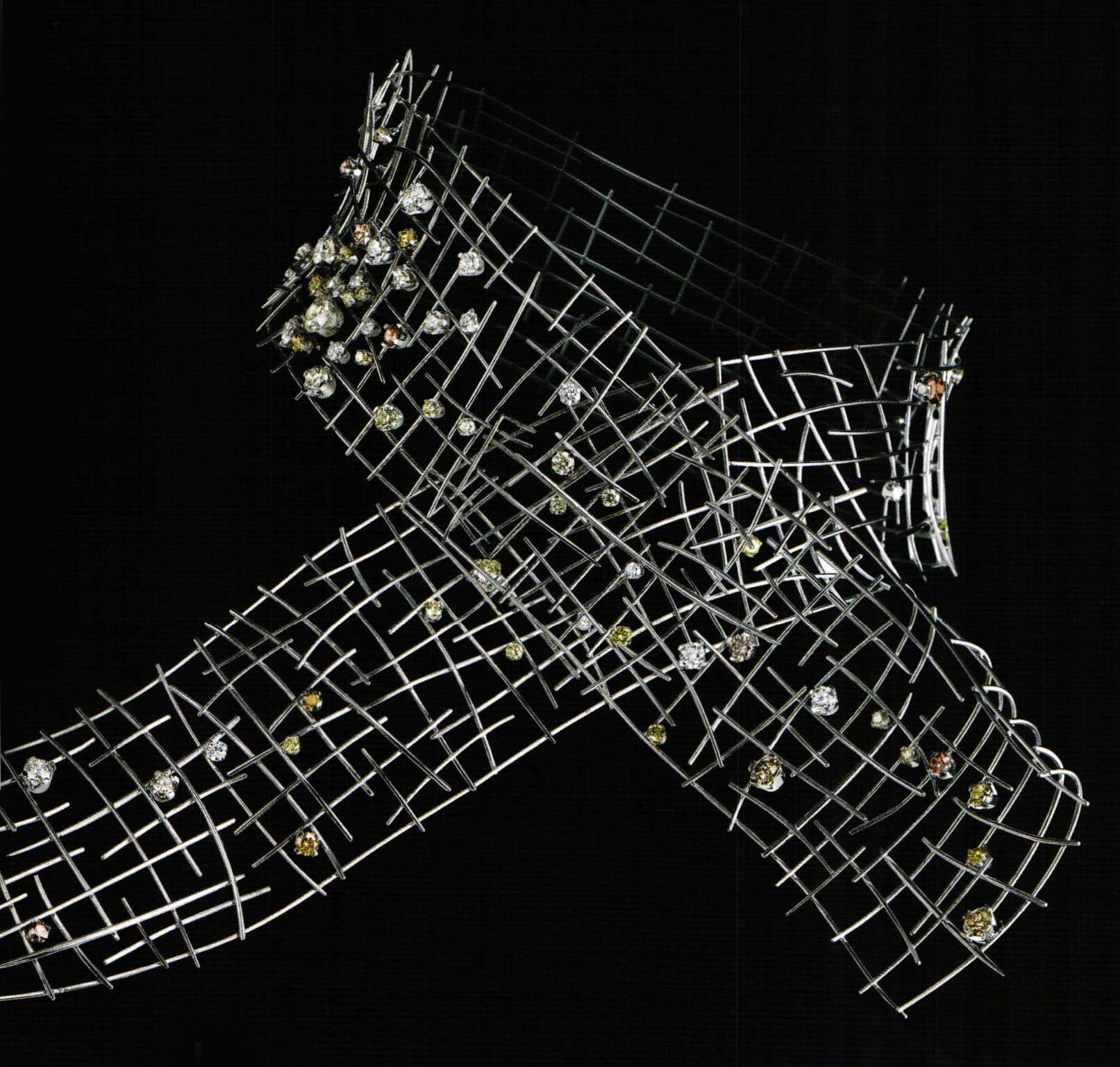 This neckla ce by multi-award winning designer Jeanne Barnes in white gold and blue Perspex with 749 diamonds won over t he jury. The designer drew her inspiration from the idea of a roaring waterfall