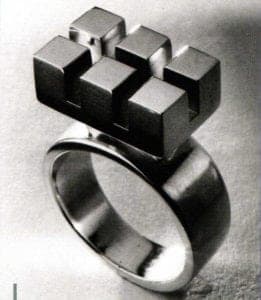 What always interested Persson was the formal development of specific topics. In spring of 1960, he developed 77 rings from precious materials for the Stockholm department store Nordiska Kompaniet and later he worked on "7 x 7" bangles, ear jewelry and expansive neck jewelry. With very few exceptions, his pieces are body jewelry to be worn with an aura of clarity and purism. Large cuboid stones made of glass or acrylics set colorful accents while depriving the jewelry of any strictness. Sigurd Persson was always curious about trying out new things and designs and his jewelry was always influenced by Swedish functionalism. He enjoyed combining this clear and geometric style with witty quotations tailormade to Persson's essence, a modest and humorous person.