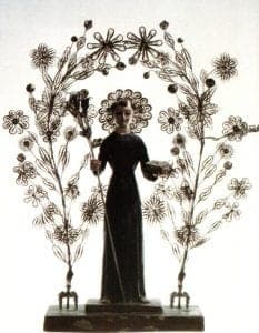 Throughout the Iberian world, including the South American colonies, the devout would decorate statues of the Virgin and the saints and their altars with small cast or sheet silver and gold votive offerings called milagros or ex-votos. These miniature animals, human figures, body parts, plants, and other objects were given to an image in thanks for an answered prayer, or in fulfillment of a vow (promesa). The faithful also adorned their favorite santos with gifts of jewelry, some of it very valuable and jewel-encrusted. Gold and silver earrings, necklaces (gargantillas), crosses, rosaries, and rosario necklaces were not only hung on the sacred image, but, in the Andes, jewelry and gold and silver decorations were also sometimes sewn onto the canvas painting of a beloved or miraculous image. The revered Virgin of Guadalupe of Chuquisaca (Sucre, Bolivia), painted by Fray Diego de Ocaña circa 1600, is festooned with gold and silver jewelry to the extent that only the hand and black face of the Virgin and her child are visible in a glittering sea of appliquéd silver and gold objects and pearls. The Virgin de Guápulo (Ecuador) is another image that has been thus decorated.