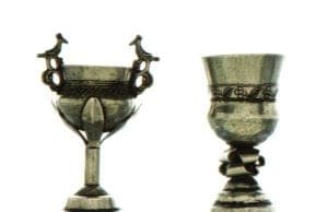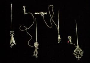 In those areas where the indigenous culture maintained a strong presence: the rural highlands, and such urban centers as Cusco (the ancient Incan capital), Cuenca, Otavalo, Quito, Potosi, La Paz, Popayán, and Tucumán, Indian silversmiths continued to craft traditional items for natives and mestizos. Travelers carried chifles (oxen horns decorated with engraved bands of silver) that served for carrying liquids, especially pisco (brandy). Sometimes the chifle was completely crafted of silver in the shape of a horn. Bastones de manda, silver and chonta wood canes decorated with coins and personal talismans, were carried by village and clan headmen as badges of office. K'eros (beakers or tumblers), akillas (footed cups), and cochas (shallow, two-handled silver bowls, sometimes with a bull, condor, or llama in the center) were ceremonial drinking vessels based on pre-Hispanic forms. Silversmiths also produced a variety of traditional silver jewelry items. Tupus, pins used since ancient times by Andean women to fasten their shawls, were created in a variety of fanciful forms and designs. Cast miniatures were made for use as milagros or as dijes (charms) for women's rosario necklaces of trade beads, coins, and crosses, men's coca bags (bastones de manda), and other uses. In Chile, native silversmiths crafted traditional Araucanian silver jewelry up to modern times: headbands, collars, breastplates, large earrings, tupus, and other items of silver sheet, silver studs, and coins.