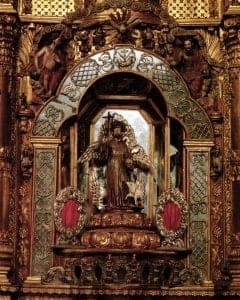 Other ecclesiastical silver forms were either unique to or typical of the Andean region. In rural churches, chalices, like the ancient Andean Indian k'ero and cochas (beakers and two-handled bowls used for ceremonial drinking) were sometimes decorated with tassels of silver chain, coins, and beads. In highland Bolivia, mayas, usually triangular or oval plaques with elaborate repoussé floral motives, were placed behind vases of flowers. Navetas (incense vessels in shapes reminiscent of Spanish ships (naves) were companion pieces to incensarios (censers). Sahumadores (perfumers) were used in some churches, their liturgical rather than domestic purpose indicated by a small cross on the top of the vessel. Saint figures (santos), large or small, were sometimes cast completely or partially in silver. In colonial Ecuador, a polychrome mask of silver or lead was sometimes used as the face for a carved wooden saint figure. Polychrome wood santos were often adorned with silver crowns, miters, aureoles, radiants and potencias (rays) as well as silver attributes: a plate of eyes for Santa Lucia, a silver fish for San Rafael, silver wings for archangels, silver equestrian gear for Santiago's (St. James') steed, a pair of silver or gold sandals for the Niño Jesús, and so forth. Portable altars (retablos) were popular with travelers and itinerant clergy. While most of these triptychs were made of wood and gesso, some were exquisitely crafted in silver.